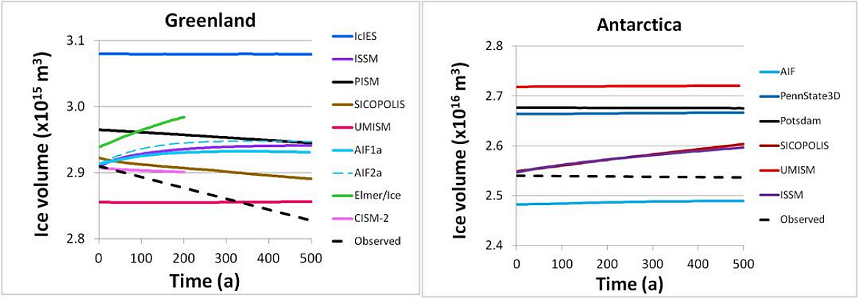 Two versions of PISM were among the ten ice sheet models used to study sensitivity of the Greenland and Antarctic ice sheets to prescribed changes of surface mass balance, sub-ice-shelf melting and basal sliding. Results exhibit a large range in projected contributions to sea level change. In most cases, the sea-level-relevant ice volume lost is linearly dependent on the strength of the forcing. Combinations of forcings can be closely approximated by linearly summing the contributions from single forcing experiments suggesting that non-linear feedbacks are modest. Our models indicate that Greenland is more sensitive than Antarctica to likely atmospheric changes in temperature and precipitation, while Antarctica is most sensitive to increased ice-shelf basal melting. An experiment approximating the IPCC’s RCP8.5 scenario produces first century contributions to sea level of 22.3 and 8.1 cm from Greenland and Antarctica, respectively, with a range among models of 62 and 14 cm, respectively. By 200 years, projections increase to 53.2 and 26.7 cm, respectively, with ranges of 79 and 43 cm.
