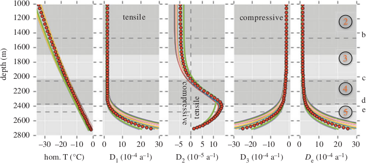 Sometimes what you need from an ice sheet model is a context for your measurements. In this paper ice microstructure (crystal orientation, grain size/shape), visual stratigraphy, and borehole tilt were measured in the EDML core drilled in Dronning Maud Land, Antarctica. Microstructures reflect the dynamic conditions of the location as well as its thermodynamic history, and determine rheological effects. PISM was used to generate the flow field and temperatures at depth at the ice core site from the large-scale geometry of the ice sheet and surface inputs. The details of structural observations were evaluated using principal strain rates from PISM, with comparison to with borehole logging data. This comparison confirms the division of the core into five depth regions (figure) and in turn provides a wider view of the ice sheet.