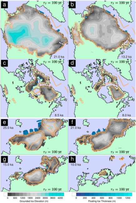 Reconstructions of the time-dependent geometry of ice sheets over the last ice-age cycle (100kyr) can draw from two categories of data. On one hand there are constraints from observations of GIA (glacial isostatic adjustment) and of eustatic sea-level through marine sediment stratigraphy. These are constraints on ice geometry but via temporal and/or spatial integration. On the other hand there is high temporal resolution, but geographically local, information in ice cores about climate over the same period. The former category informs the output (ice thickness and grounding line) of the ice sheet evolution equations while the later inform the input (source term). Like Stuhne & Peltier (2015), this paper connects the two categories using PISM. Because climate-record-driven applications of PISM, such as the SeaRISE project, already use well-posed simulations, a reconciliation of the two data categories is necessarily a temporal/spatial inversion. Here the goal is close fit to the GIA+eustatic-record-based ICE-6G_C ice thickness reconstruction from tuned (“nudged”) climate-input-driven PISM runs. These authors analyze the amount of surface mass balance correction, applied using hypothesized characteristic time scales, needed to reduce the error between PISM output and ICE-6G_C. An example of the usefulness of this methodology is in diagnosing the origin of Meltwater Pulse 1B (-11kyr). They suggest it is more likely to have been in North America than in Antarctica, its origin in the ICE-6G_C reconstruction.