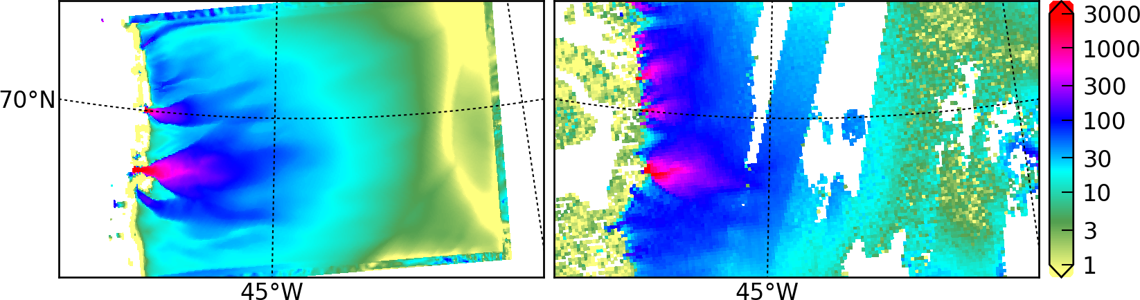 Fig. 44 Left: modeled surface speed at the end of a 2 km grid, 100 model year, steady present-day climate run. Right: observed surface speed, an average of four winter velocity maps (2000,2006–2008) derived from RADARSAT data, as included in the SeaRISE 5 km data set [144], for the same region. Scales are in meters per year.¶
