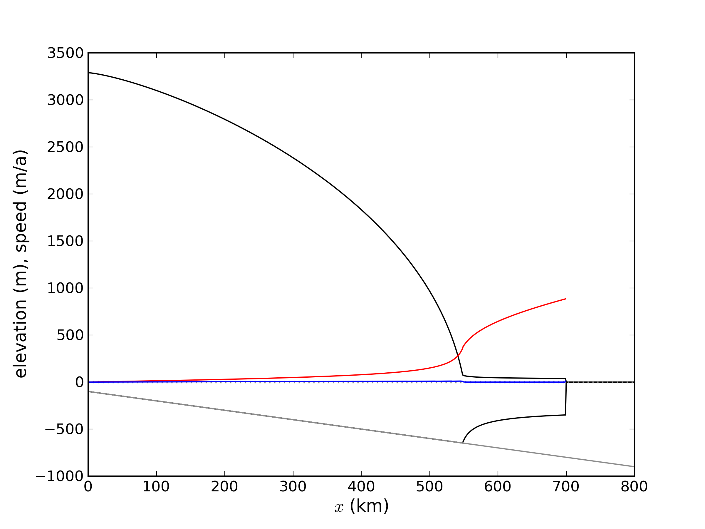 steady state ice geometry is plotted (black) together with the computed SSA velocity