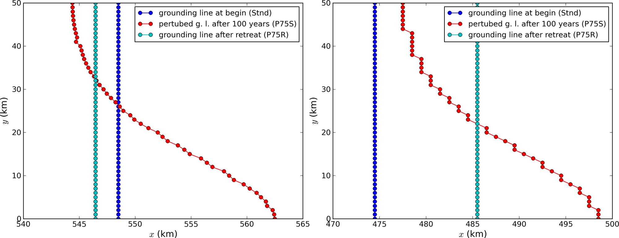 Fig. 26 Comparison between the grounding lines of the higher-amplitude (”P75”) MISMIP3d