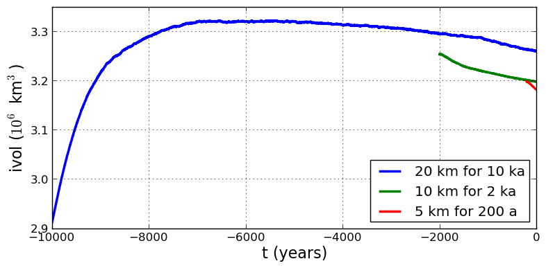 Fig. 11, which shows time series of ice volume, also shows the cost of high resolution, however. The short 200 a run on the 5 km grid took about 3 wall-clock hours compared to the 10 minutes taken by the 10 ka run on a 20 km grid. The fact that the time series for ice volume on 10 km and 5 km grids are not very “steady” also suggests that these runs should actually be longer.