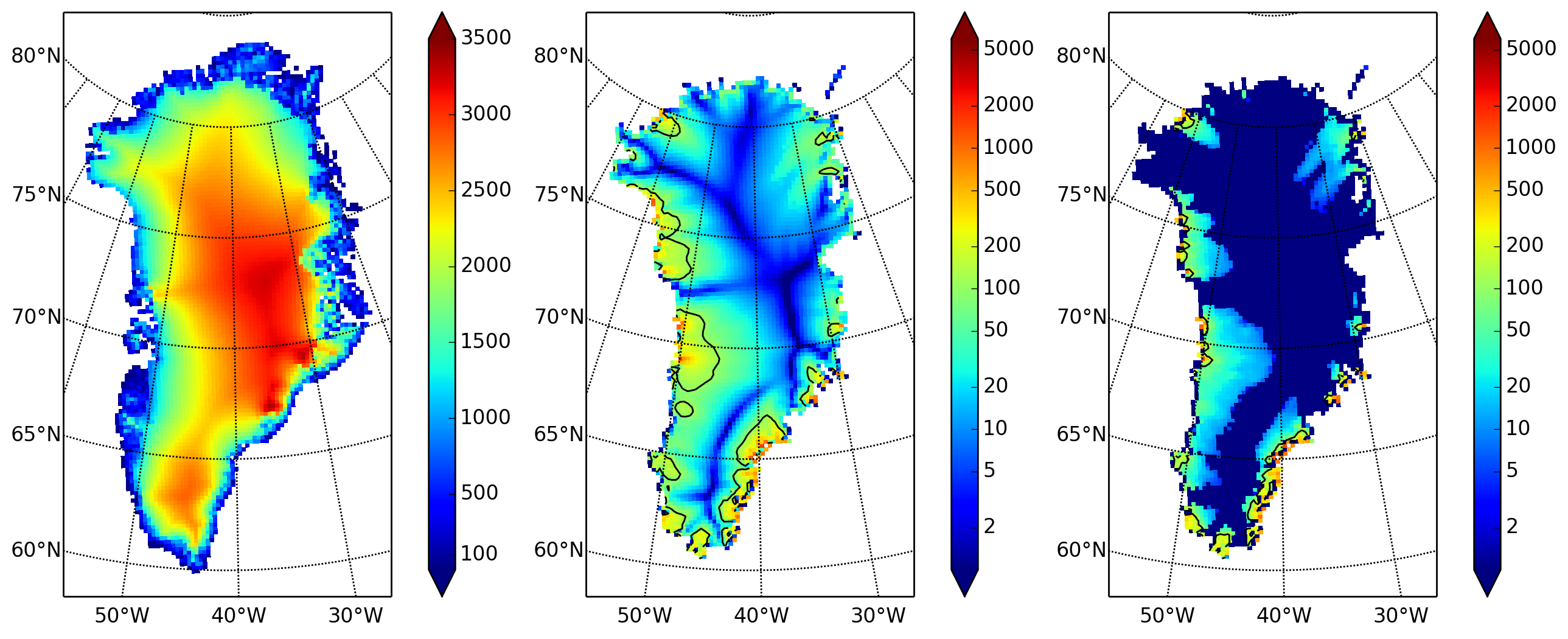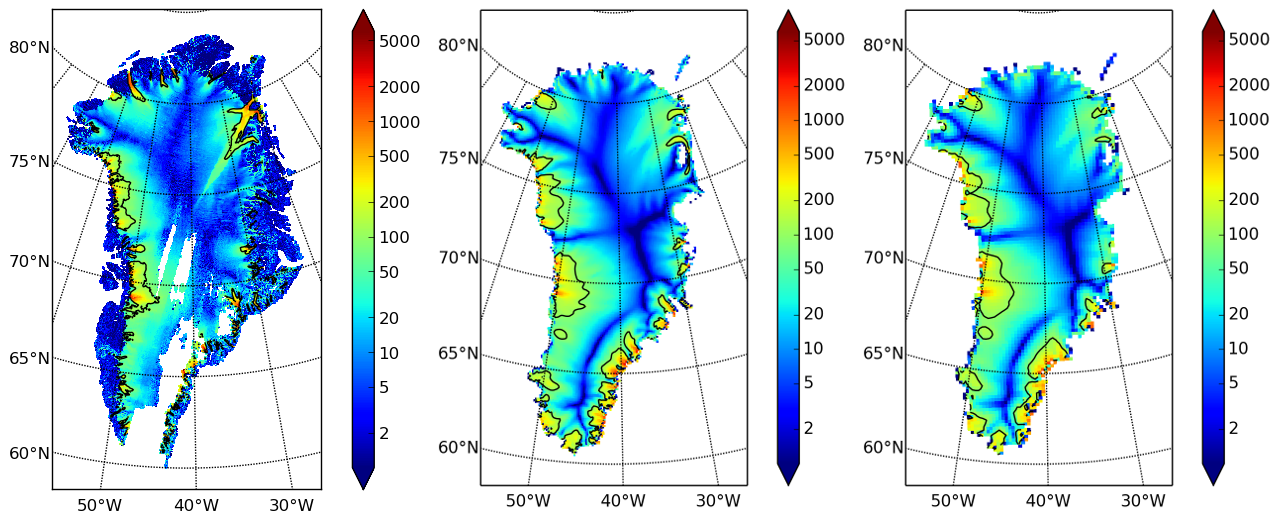 surfvelmag, the observed values from SeaRISE data fileGreenland_5km_v1.1.nc.- Middle: