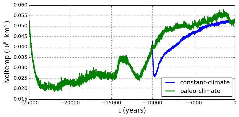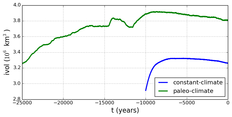 (blue; ts_g20km_10ka_hy.nc) and paleo-climate (green; ts_g20km_25ka_paleo.nc)