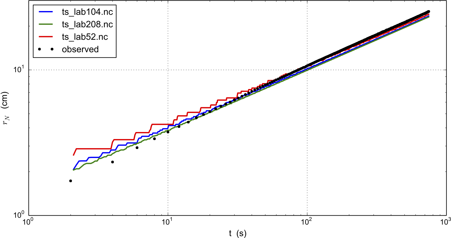 Fig. 41 Radius \(r_N(t)\) for runs with 10 mm (ts_lab52.nc), 5 mm (ts_lab104.nc), and 2.5