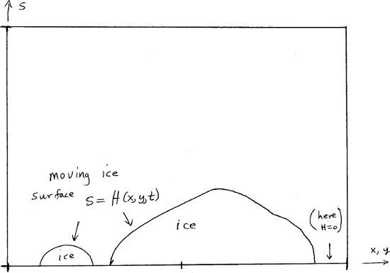 Fig. 49 In (x,y,s) space the ice fluid domain only has an upper surface which moves, \(s=H(x,y,t)\). Compare to Fig. 48.¶
