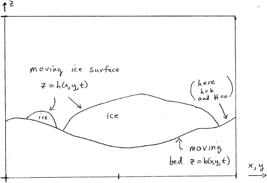 Fig. 48 The ice fluid domain evolves, with both the upper and lower surfaces in motion with respect to the geoid.¶